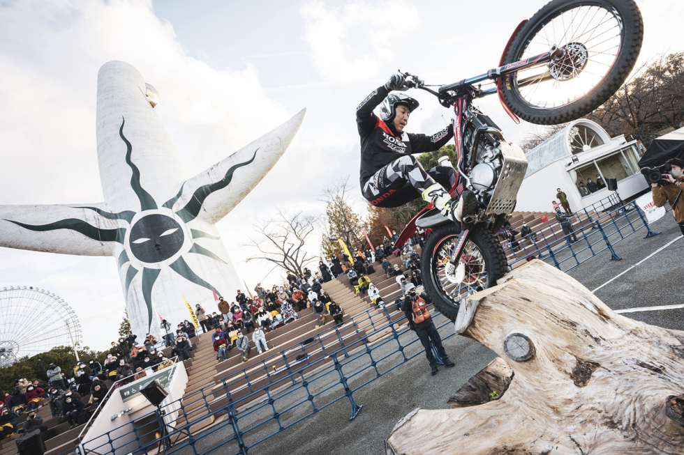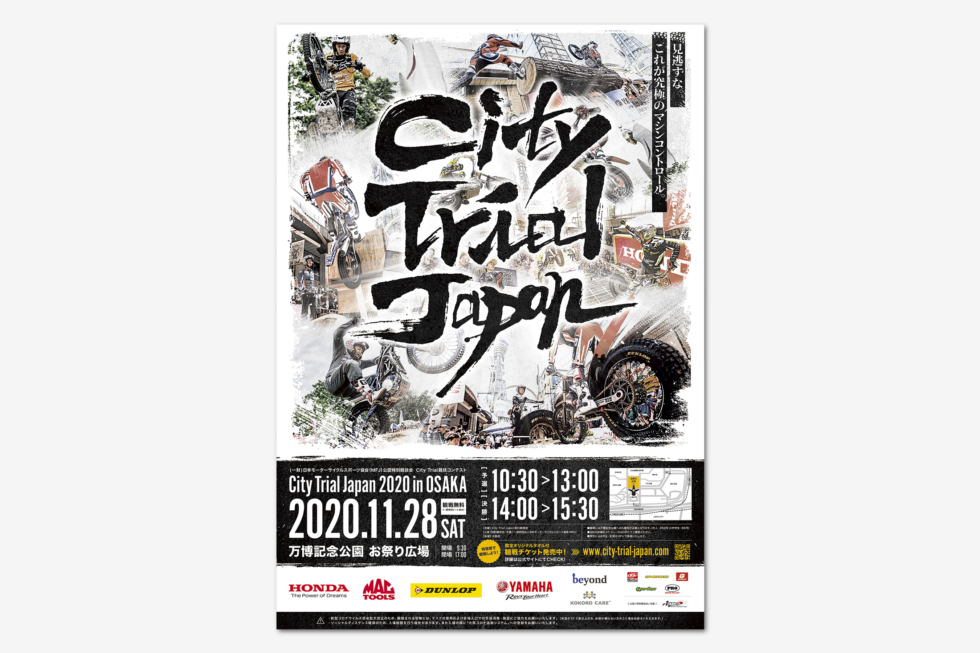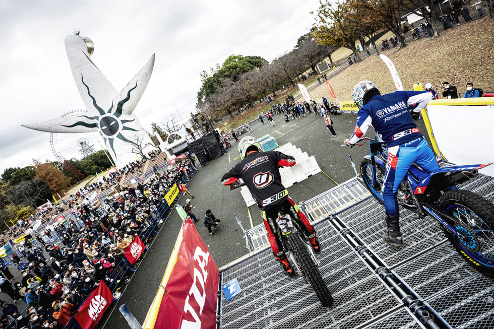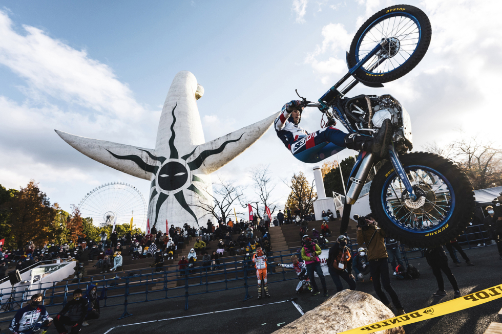 「City Trial Japan 2020 in OSAKA」は2020年11月28日万博記念公園 お祭り広場で開催されました。通常は山の中でしか見れないバイクトライアル競技を“街中”で実施しているCTJは2019よりもさらに会場スペースを広げ、トライアルの無料体験コーナーや子ども向けトライアル体験、出展・飲食ブースも大幅に増やし、これまでにない規模で開催しました。新型コロナウイルスの影響により感染予防対策や入場制限の対応など例年にない対応を迫られましたが、バイクファンのみならずお子様から大人まで多くの方に競技を楽しんでいただき、トライアルの魅力を発信することができました。