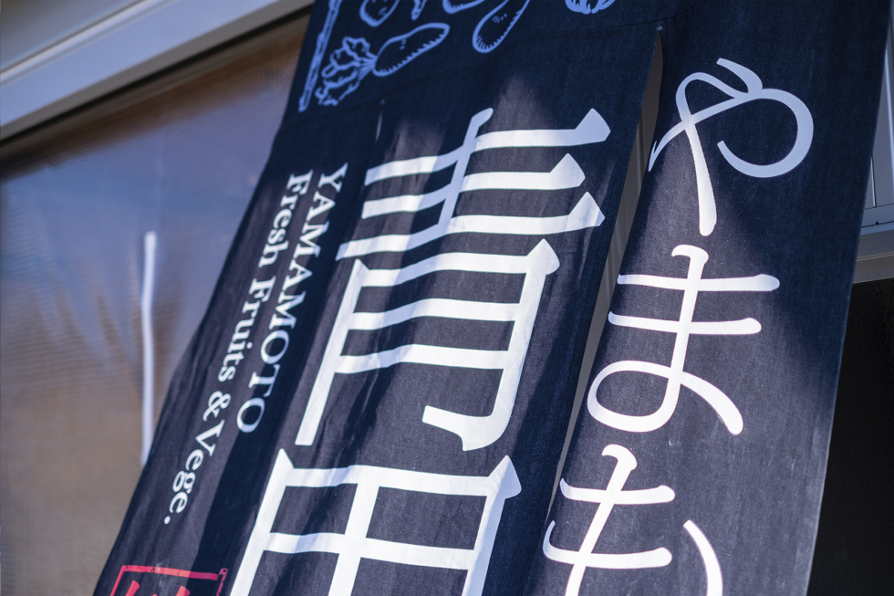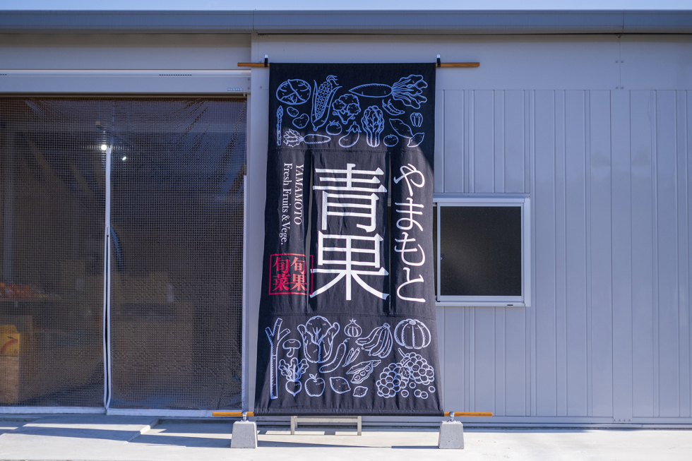 青果店は幹線道路沿いにあり、敷地内には地元の子どもたちが走り回れるほどの広いスペースがあります。その一方で、周りに目立った建物がないため、店舗だと気付かれにくい立地でもありました。そこでまずは、車を運転しながらでも一目で青果店と分かるようなコミュニケーションを図るためロゴマークを開発。やまもと青果では、「旬果旬菜」の視点から、季節ごとの新鮮な野菜や果物を独自の目利きで取り揃えていることから、美味しい青果をきっかけに地域の人々が集いコミュニケーションが生まれる場所になるように、やさしい風合いのイラストを用いたデザインをご提案させていただきました。