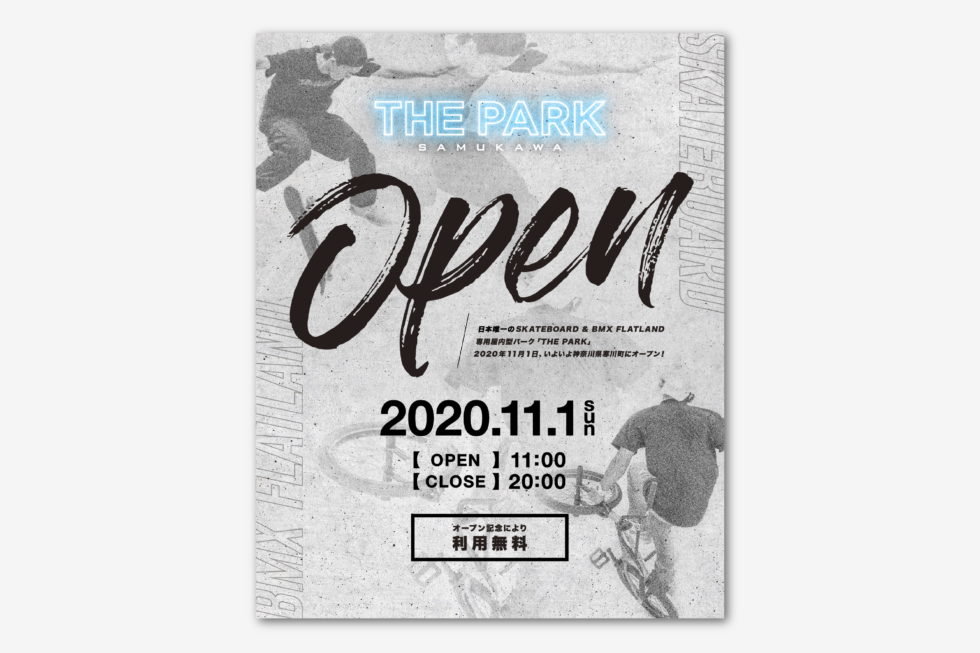 2019年にストリートスポーツの世界的祭典「ARK LEAGUE」の舞台となった神奈川県・寒川町に新たにオープンした、BMXとスケートボードの複合施設「THE PARK SAMUKAWA」のロゴデザインを制作させていただきました。武骨な工業用倉庫をリモデルして造られた当施設は、世界のトップスケーターである白井空良、池慧野巨がプロデュースした日本でも数少ない屋内コンクリートパーク。デザイン性だけではなく世界基準の機能性も持ちあわせた新たな拠点には、ストリートスポーツ界からも大きな注目と期待が寄せられています。弊社はロゴデザインと合わせてデジタルフライヤーを制作させていただきました。