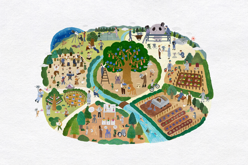 また、キービジュアルには倉敷市出身のイラストレーターnanakoさんをアサイン。経営陣をはじめ社員さんへのヒアリングを重ね、ブランドコンセプトに込められた想いをやさしい水彩画のタッチで丁寧に描いて頂きました。