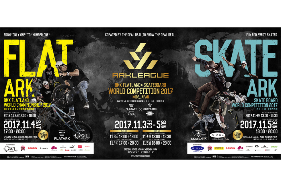2017年11月3日〜5日、神戸メリケンパークにて開催されたストリートスポーツ世界大会「ARK LEAGUE 2017」に参画しました。この大会は2013年に神戸で誕生したBMX界のビッグコンテスト「FLAT ARK」を前身として、開催5年目の節目となった2017年に東京オリンピックの追加種目に決定した「スケートボード」の世界大会「SKATE ARK」が加わり、BMXフラットランド&スケートボードの2競技によるストリートスポーツ世界大会に生まれ変わりました。弊社は実行委員会の一員として大会基本計画からクリエイティブ制作まで大会運営に関わる全ての業務に参画しています。
